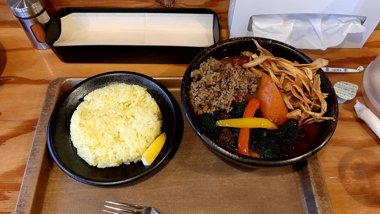 絶品ラムひき肉のスープカレー1360円のじゃがいも、サツマイモ抜きライス200gの大辛+トッピングブロッコリー135円(ランチタイムドリンク付き)。