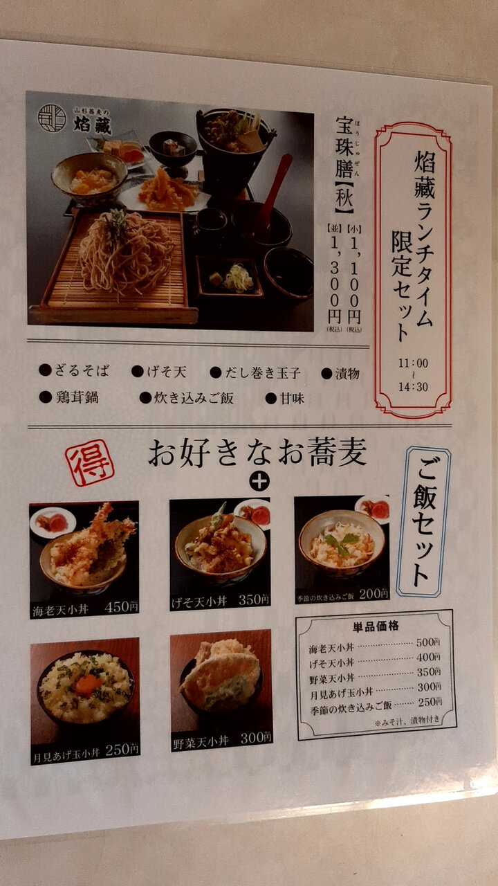 冷たい肉そば大盛り900円+税、ランチタイムセットの宝珠膳【秋】1100円(内税)。