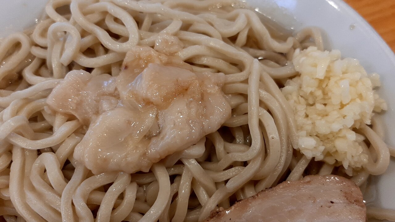 つけ麺(ラーメン790円+100円)野菜少しアブラ増しニンニク+海苔200円。